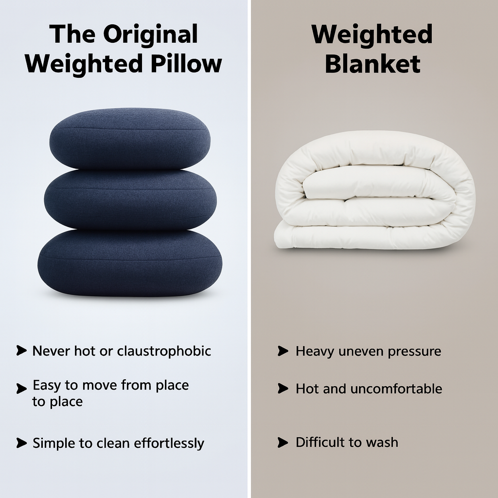 Our original Weighted Pillow is crafted from three carefully chosen materials: eco-friendly recycled glass beads that provide gentle, balanced weight; soft polyurethane foam for plush cushioning; and a durable polyester exterior designed to last. This thoughtful blend creates a pillow that’s comfortable, effective, and made with sustainability in mind.
